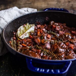 Pomme Persillade, Rustic Red Wine Braised Chicken, Sauteed Kale, Crepes Suzette.