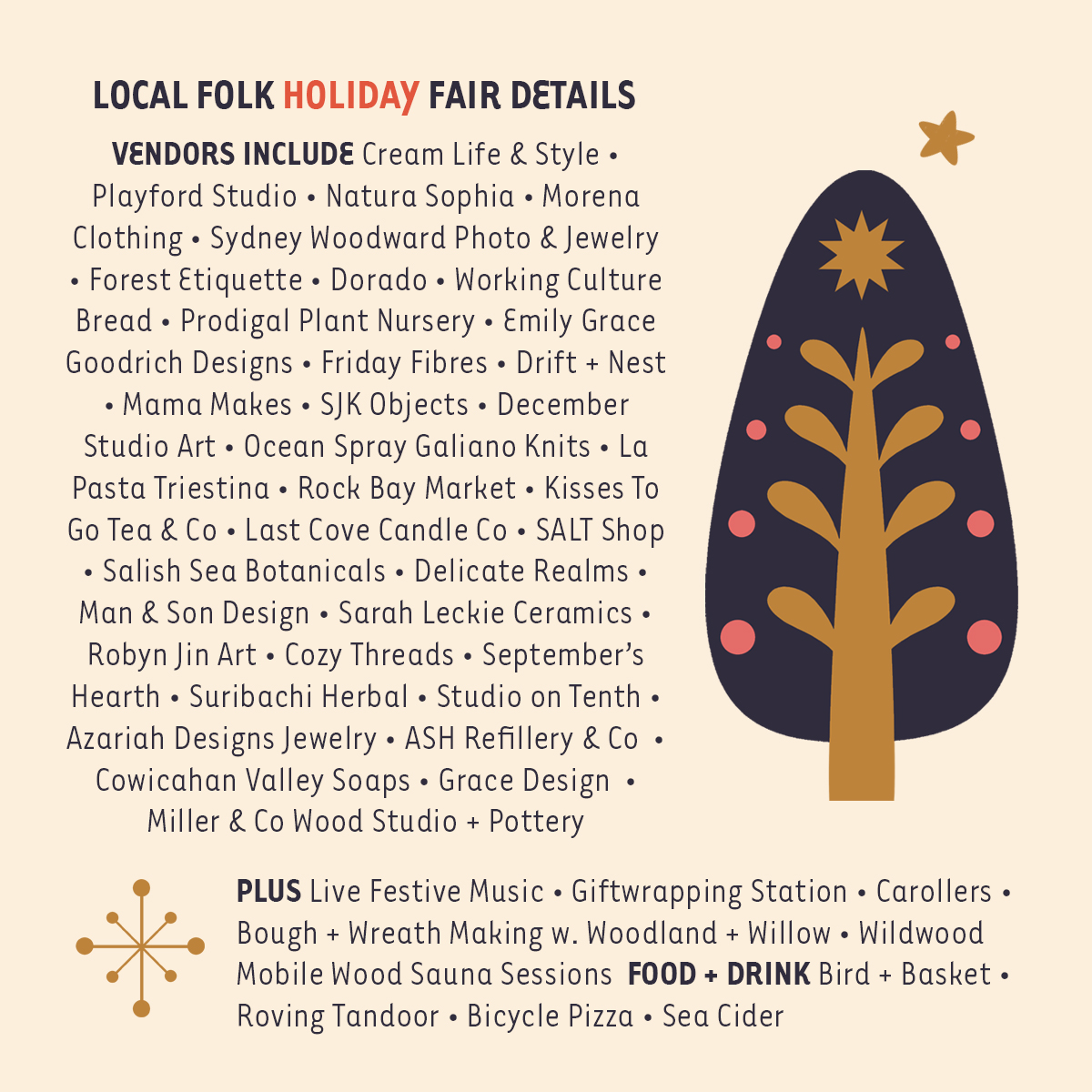 A European-style holiday market, with a West Coast charm, featuring 25 hand-picked local artisan vendors, scrumptious hot food from Bird + Basket, Roving Tandoor + Bicycle Pizza, hot mulled cider + seasonal cider, wreath + bough-making workshops, gift-wrapping, live festive music, lights and decorations, a wood sauna, fireplaces to warm around, carollers and a jolly time had by all!