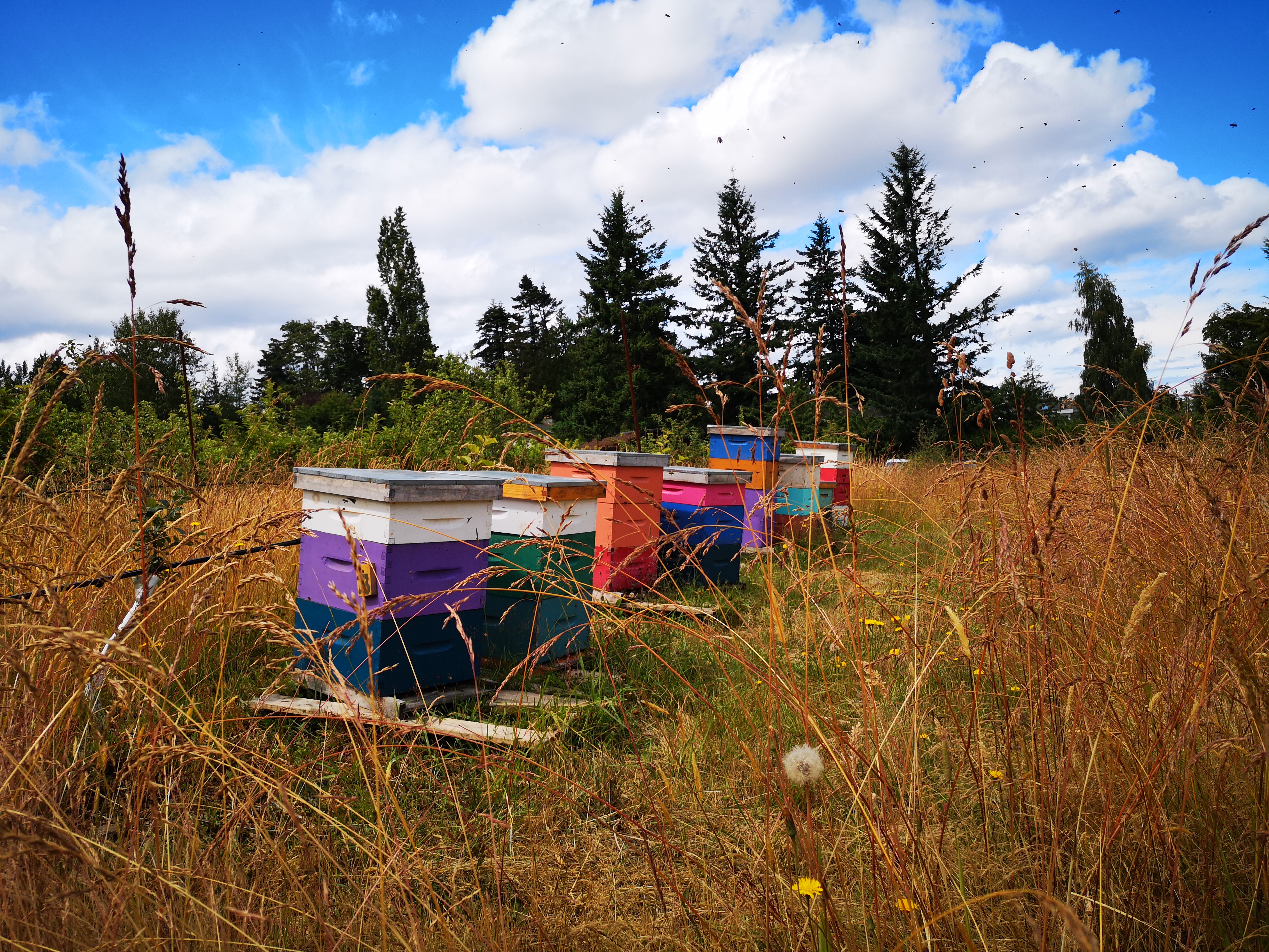 If you’ve been out to Sea Cider this spring, you may have noticed our honey bee hives in the center of our orchard. We work with the good folks over at Country Bee and wanted to ask them a bit about why we’ve been seeing so many ‘swarms’ of bees. Apparently, we have some very healthy, prolific hives – which is great news! But, it does pose a bit of a safety risk to our staff and visiting customers when our bees swarm. Lindsay from Urban Bee comes by to check on the hives occasionally and due to the active nature of our hives, she’s broken them up from time to time to prevent swarms.