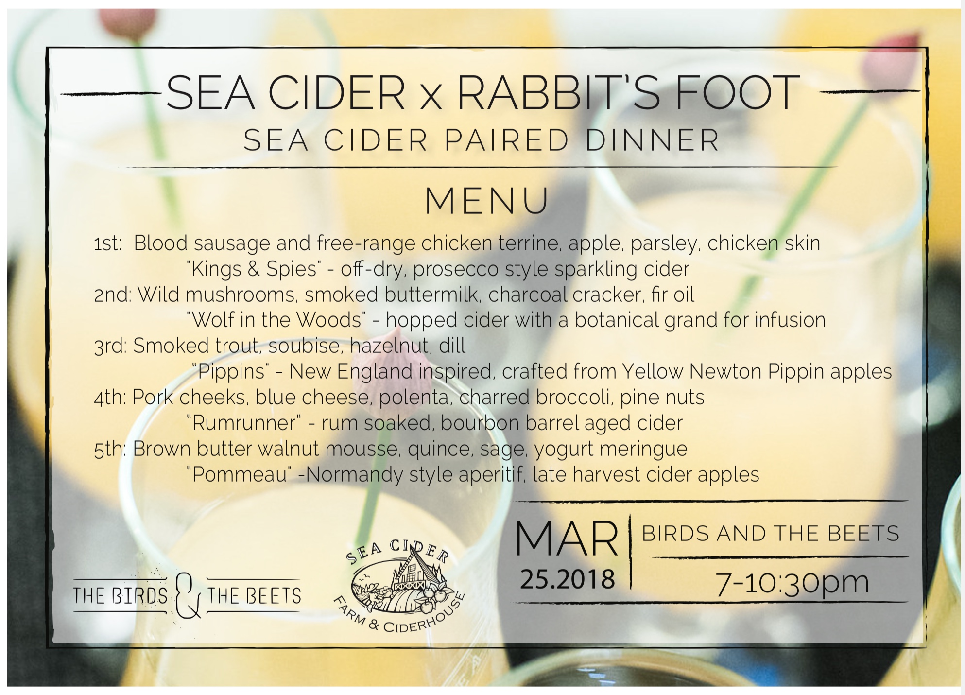 Toby and Tobias of Rabbit’s Foot Supper Club YVR have crafted a 5-course tasting menu, designed to highlight the diversity of the Sea Cider line-up, as well as showcase their own culinary talents. Each course will be accompanied by a Sea Cider pairing.