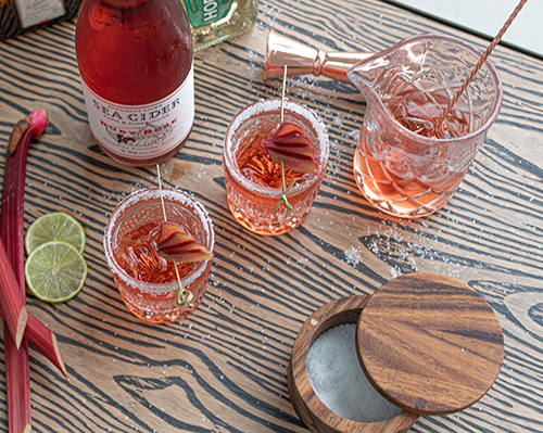 Combine 1oz Cointreau, 1oz Lime Juice, & 1½oz Tequila into a shaker with ice – shake, shake, shake! Rim rocks glass with salt to your liking and strain ingredients over fresh ice. Top it off with 1.5oz Ruby Rose Sparkling Cider and garnish with your choice of lime or rhubarb – Enjoy!